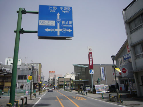 この交差点を右折すると秩父駅まで200m、左折すると秩父公園橋が見えます。